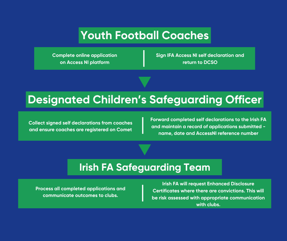 The Irish FA acts as an umbrella body for Access NI overseeing vetting checks for all volunteers from affiliated bodies and football clubs who are engaging in a regulated activity.