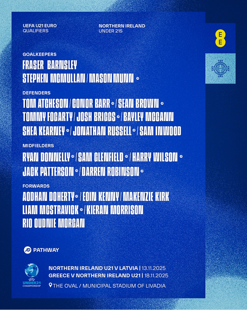 The U21s are due to take on the Latvians in the 2025-27 UEFA European Under-21 Championship qualifying group stage (Group F) at The Oval in east Belfast next Thursday (13 November) at 7.45pm.