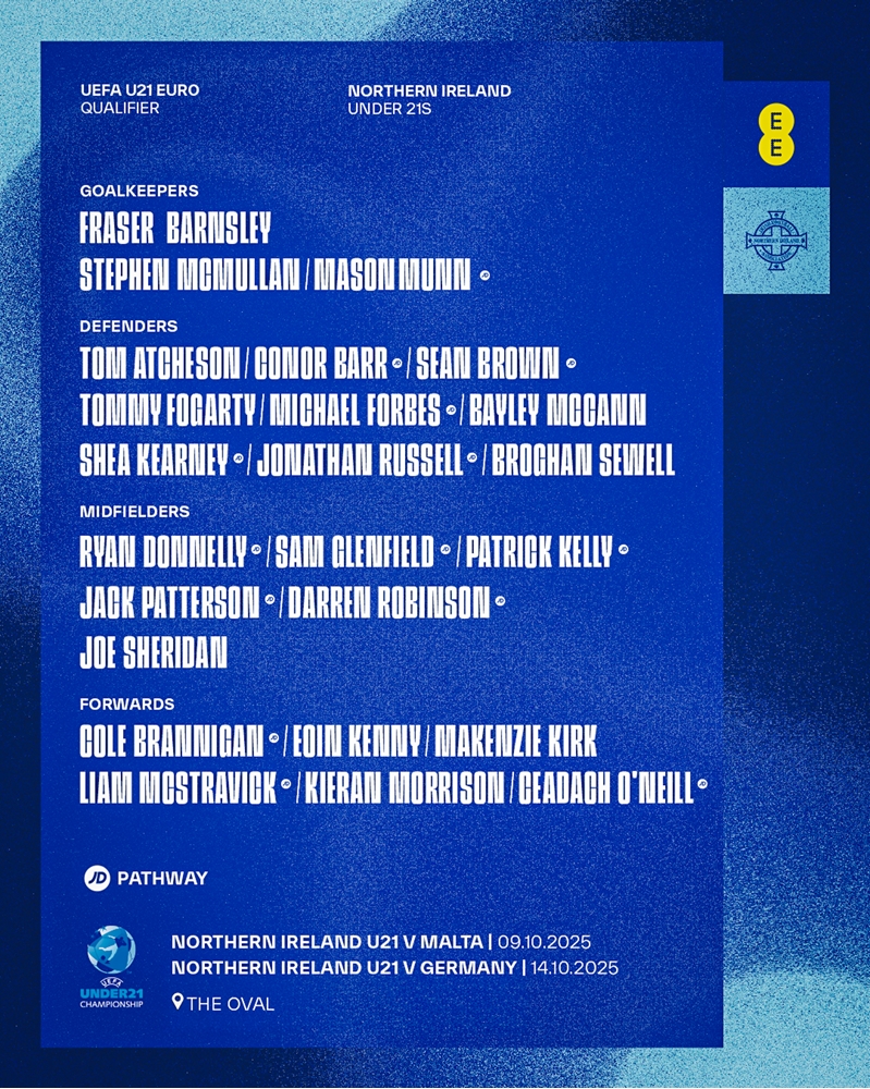 Other newcomers to the U21s include Linfield defender Sean Brown, Cliftonville midfielder Joe Sheridan, Aston Villa attacker Cole Brannigan and Liverpool forward Kieran Morrison.