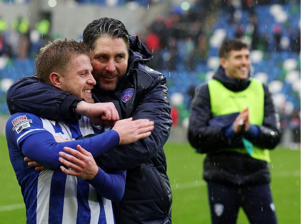 Main image: Coleraine scorers Joel Cooper (left) and Matthew Shevlin celebrate at the final whistle.